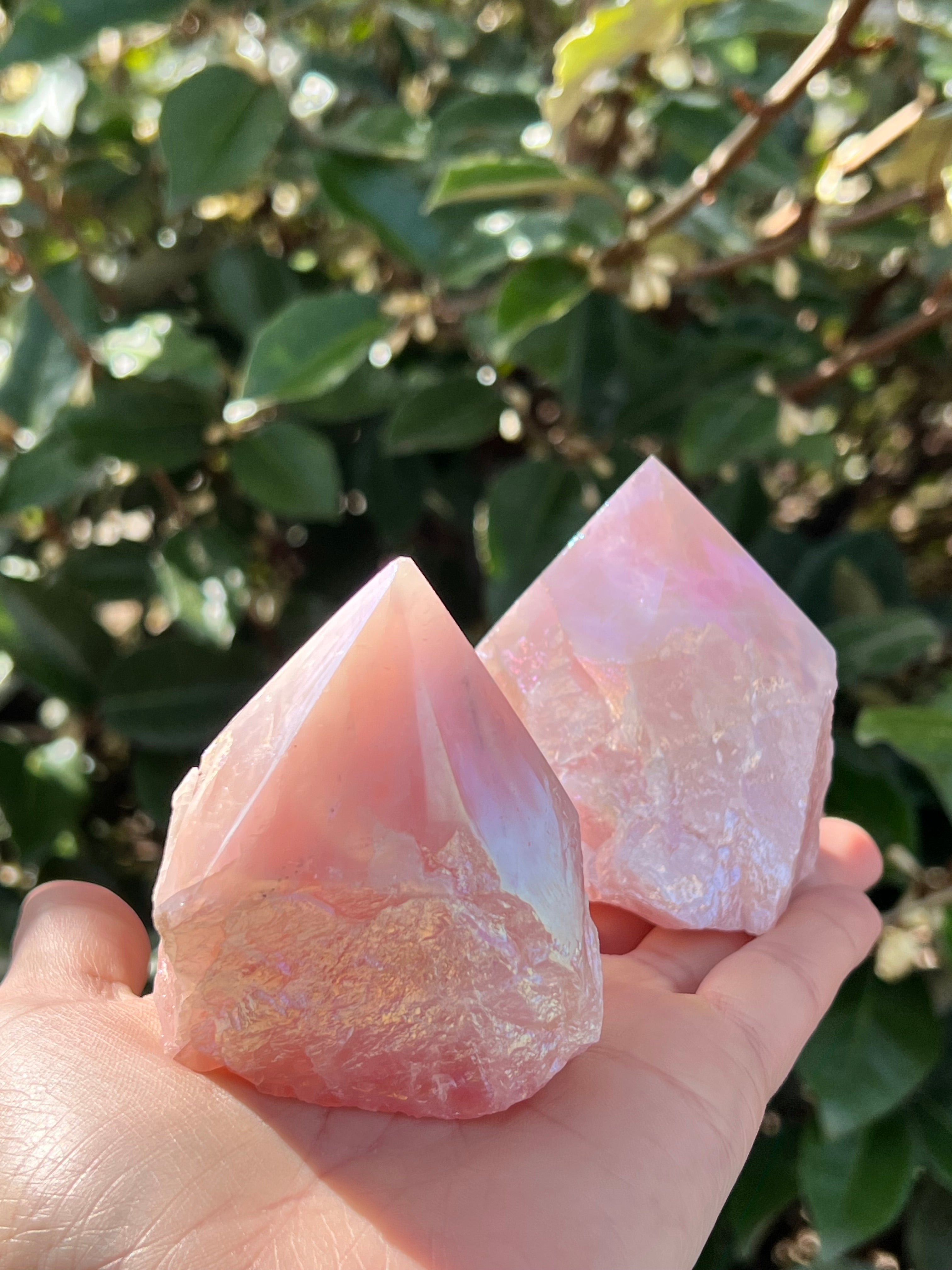 Our Aura Rose Quartz is a mesmerizing crystal created by bonding silver and platinum to natural quartz, resulting in a radiant rainbow shimmer that dances with every angle. Known as Aura Quartz, this stone strengthens and expands your auric field, amplifying your energetic presence and connection to the spiritual realm.