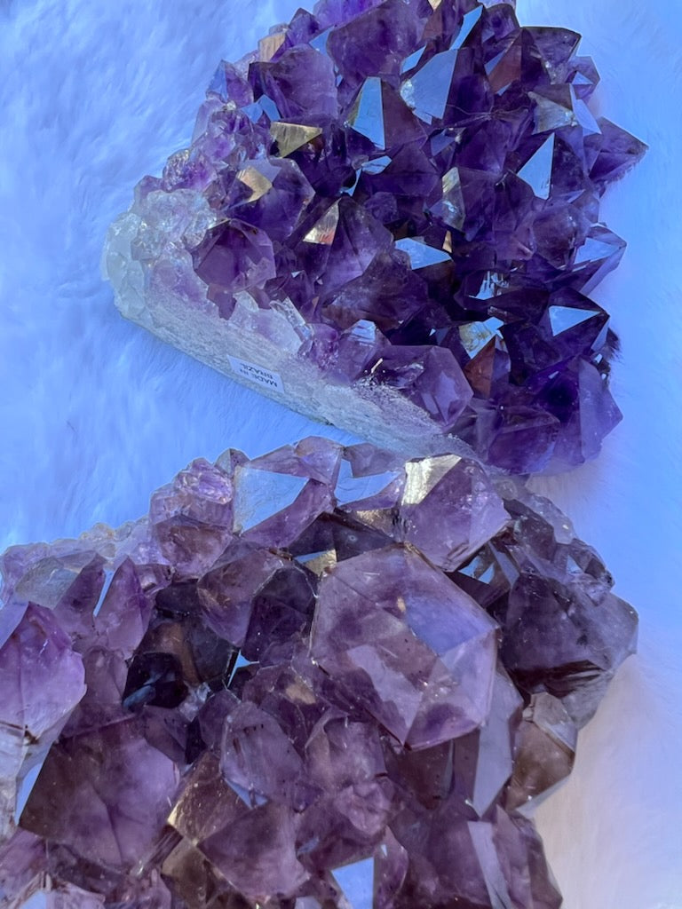 A striking display piece, this natural amethyst cluster brings tranquility and spiritual clarity. Its flat base makes it an elegant addition to any desk, shelf, or bedside table. -
