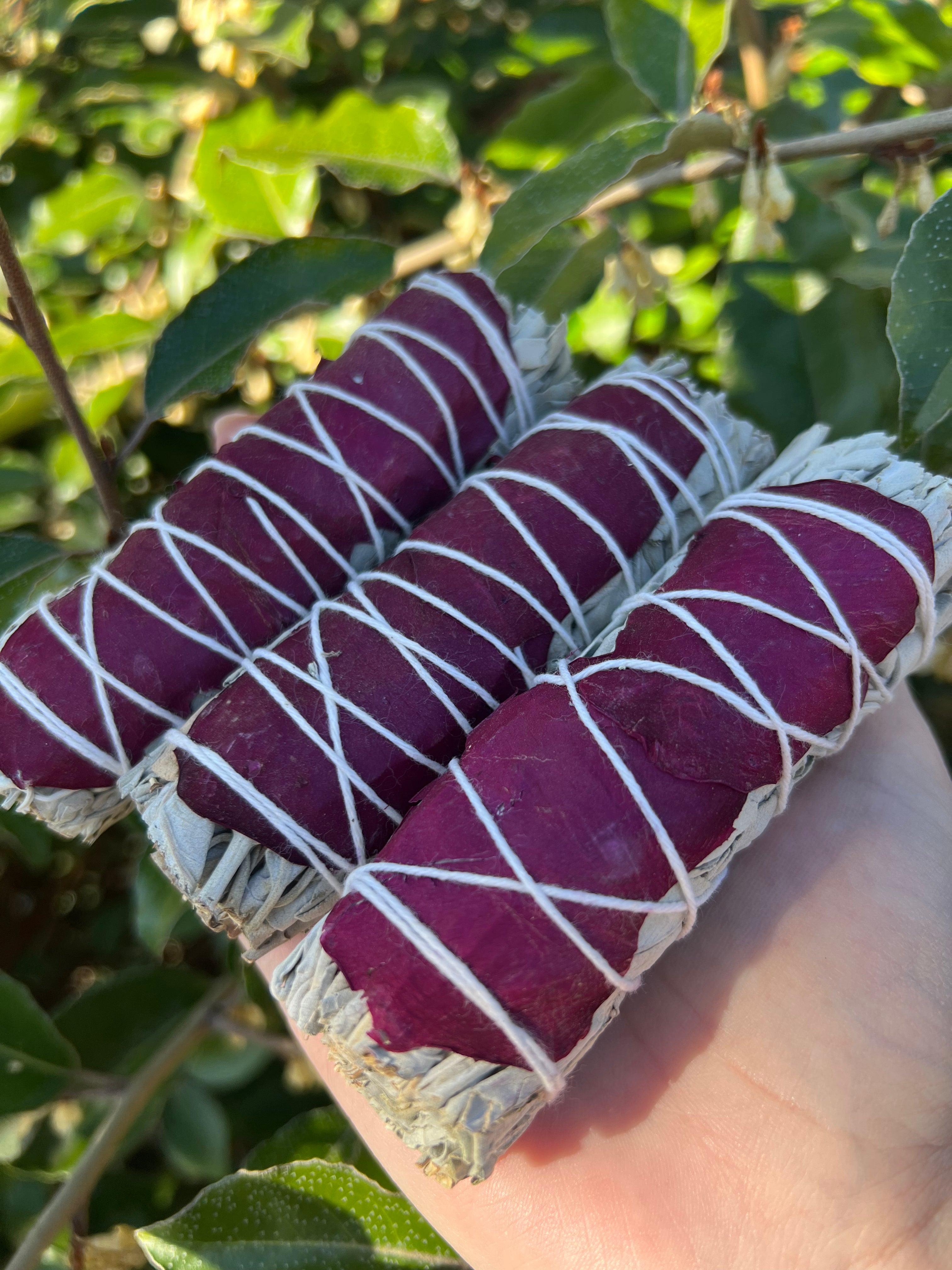 Crafted with Care: At HarleyRae, we are committed to quality and sustainability. Our Organic Red Rose Petal Sage is handcrafted in small batches using responsibly sourced White Sage and organic red rose petals. Each bundle is meticulously tied by artisan hands, ensuring that every smudge experience is infused with intention and care.