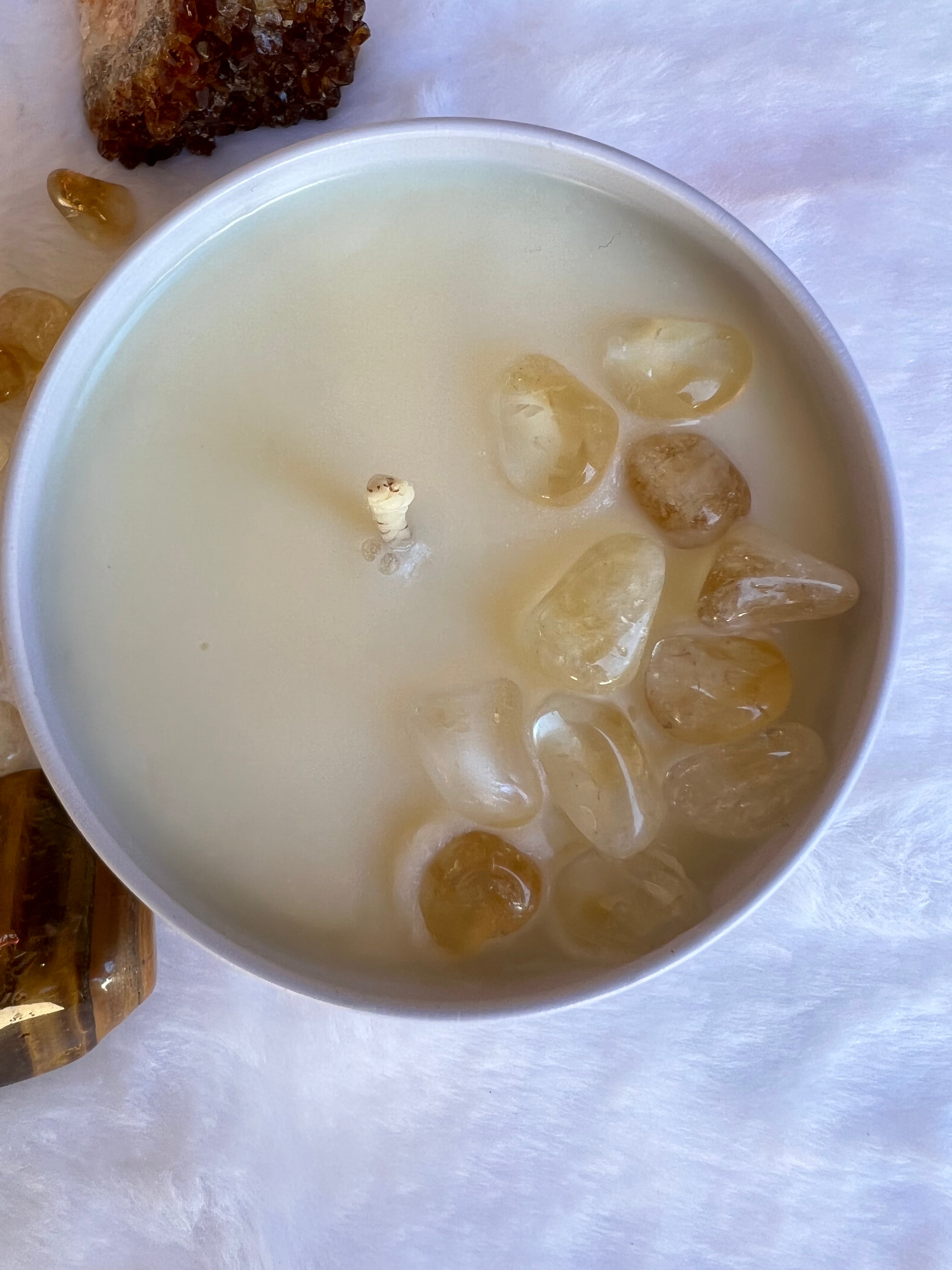 - Citrine Crystals for Wealth and Abundance: Topped with citrine, known as the stone of abundance, this candle enhances your manifesting power while promoting a bright and energized mindset.
