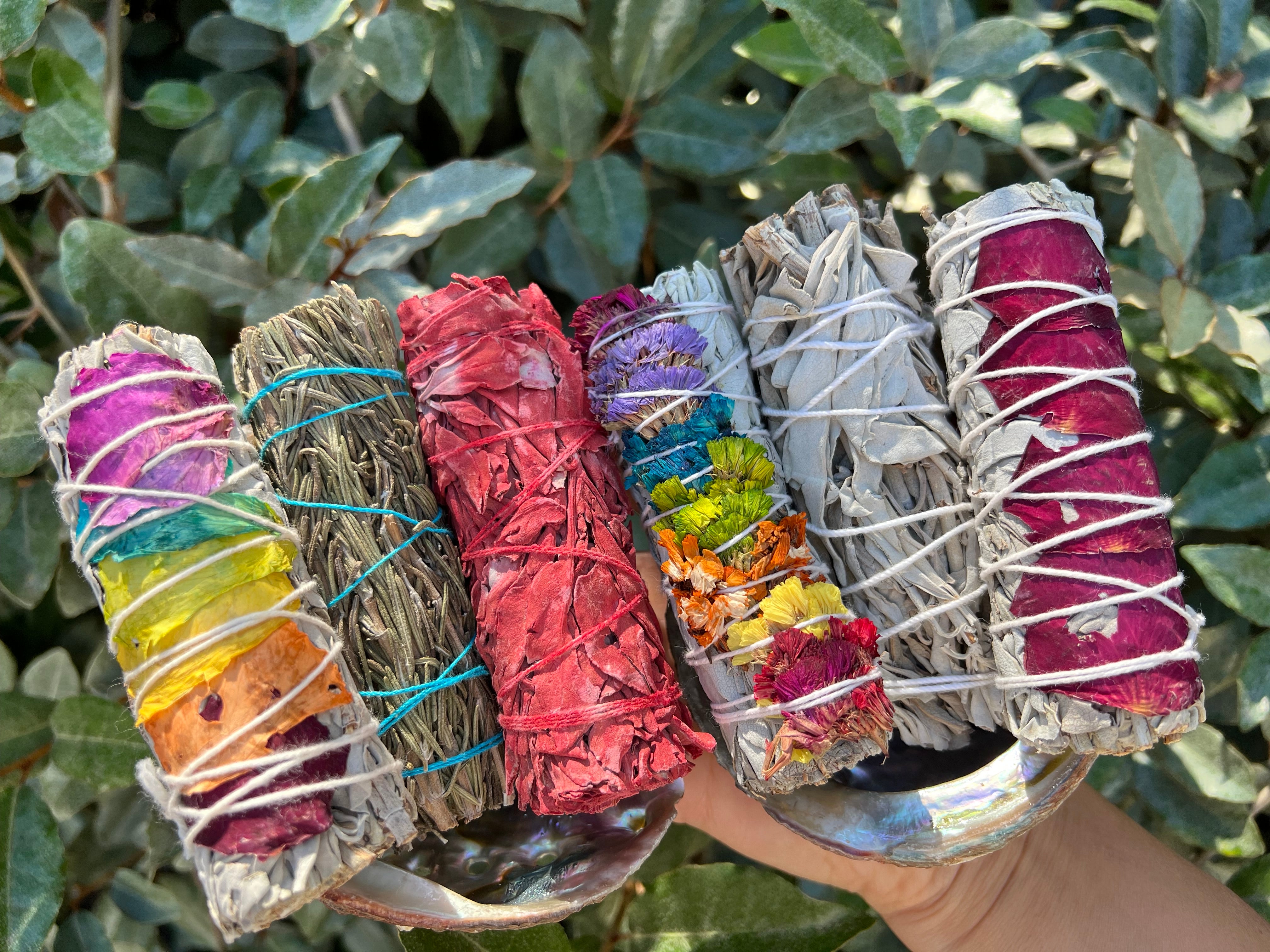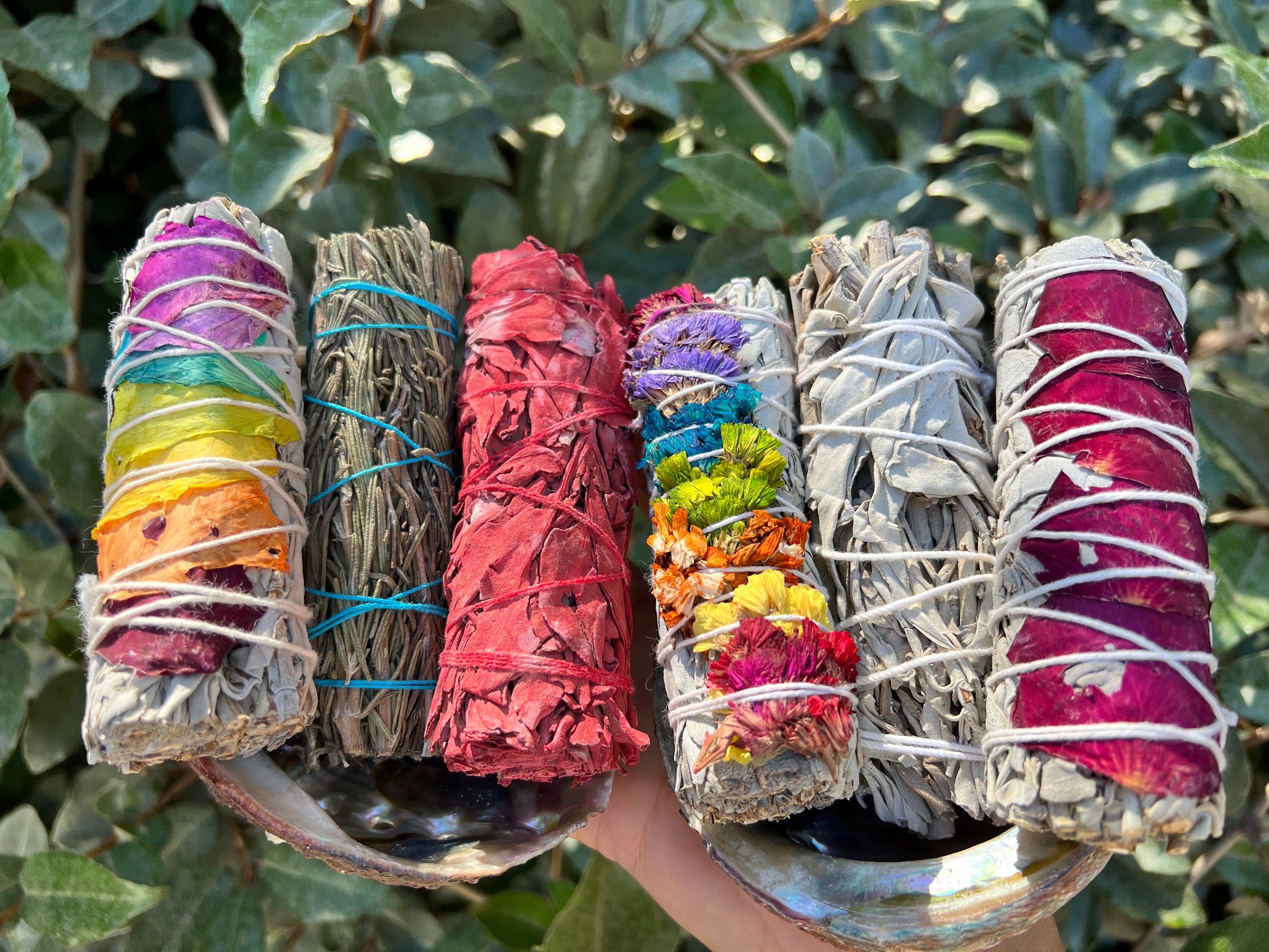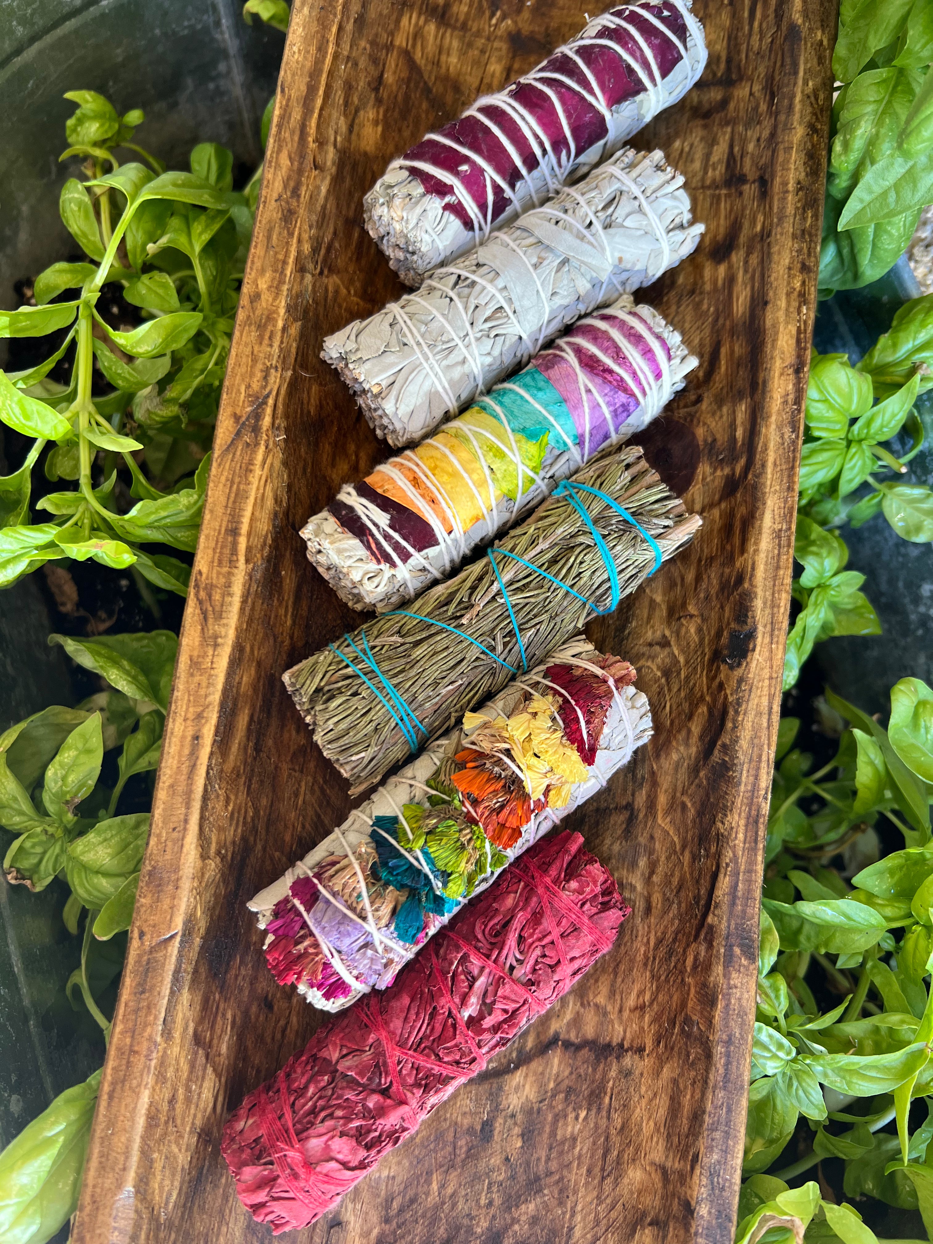 Red Rose Petal Sage: A beautiful blend of white sage wrapped with delicate red rose petals, this sage stick is perfect for love, harmony, and emotional balance.