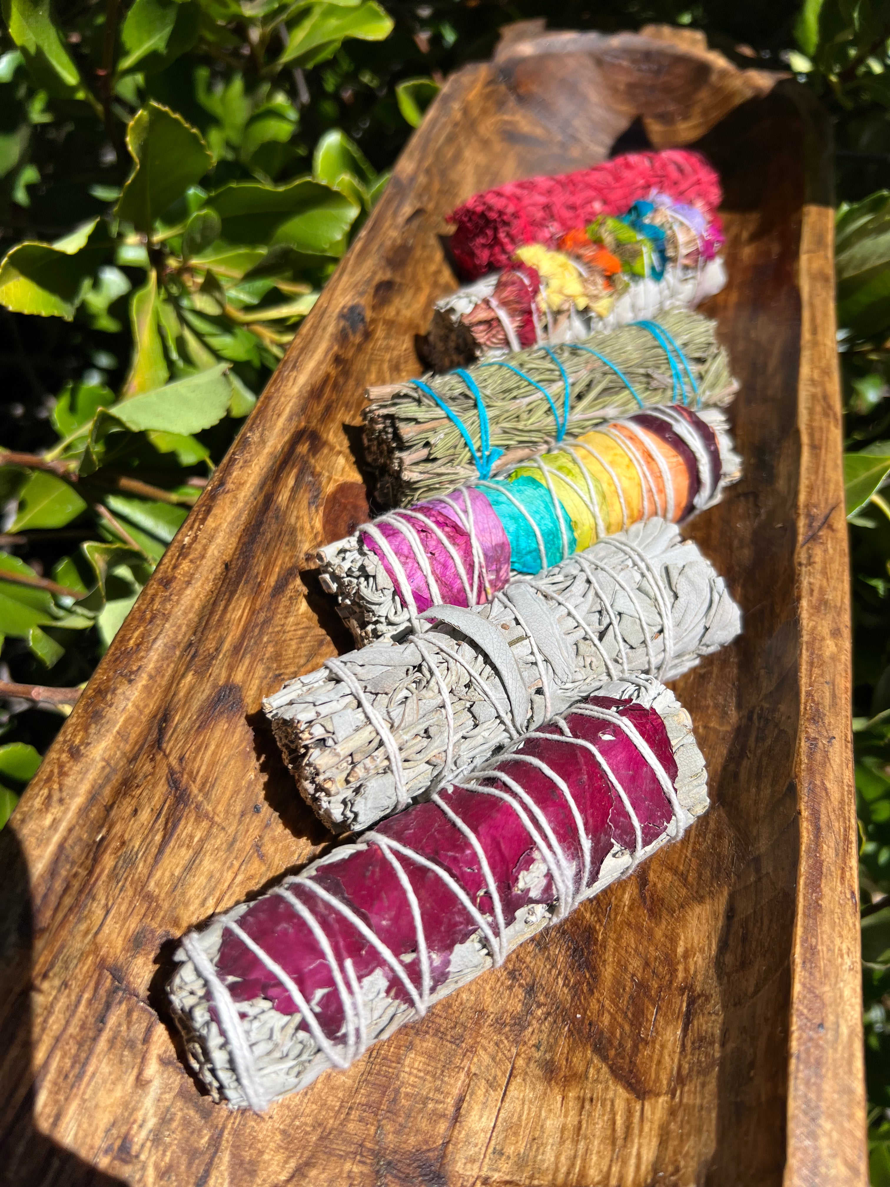 7 Chakra White Sage with Sinuata Flowers: This special sage stick features white sage combined with a rainbow of sinuata flowers, each representing one of the seven chakras, to promote holistic healing and spiritual alignment.