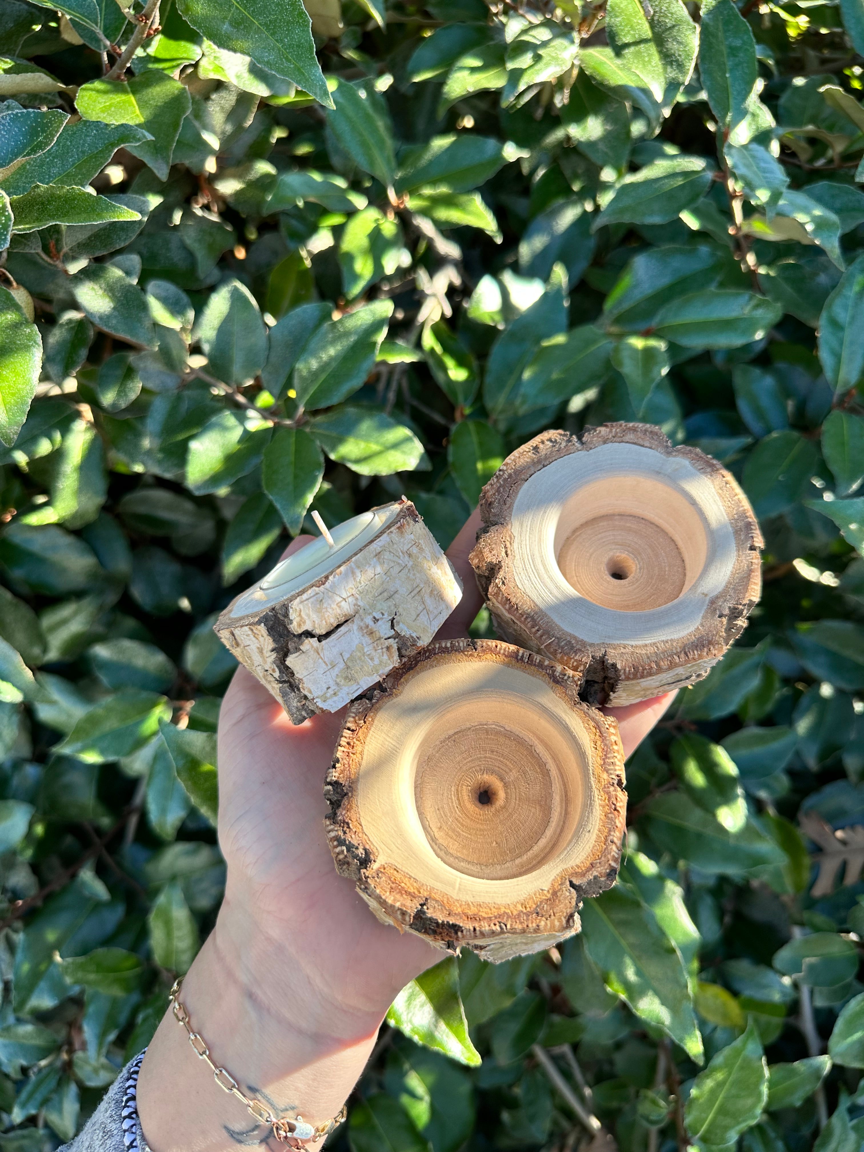 Real wood tea light candle holders handmade with love from California White Birch tree branches. Hand crafted by Doug Bishop -our newest member of the family!